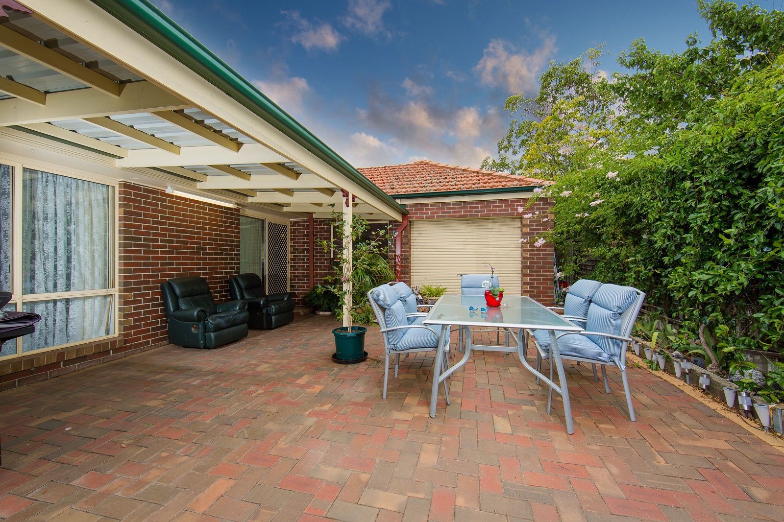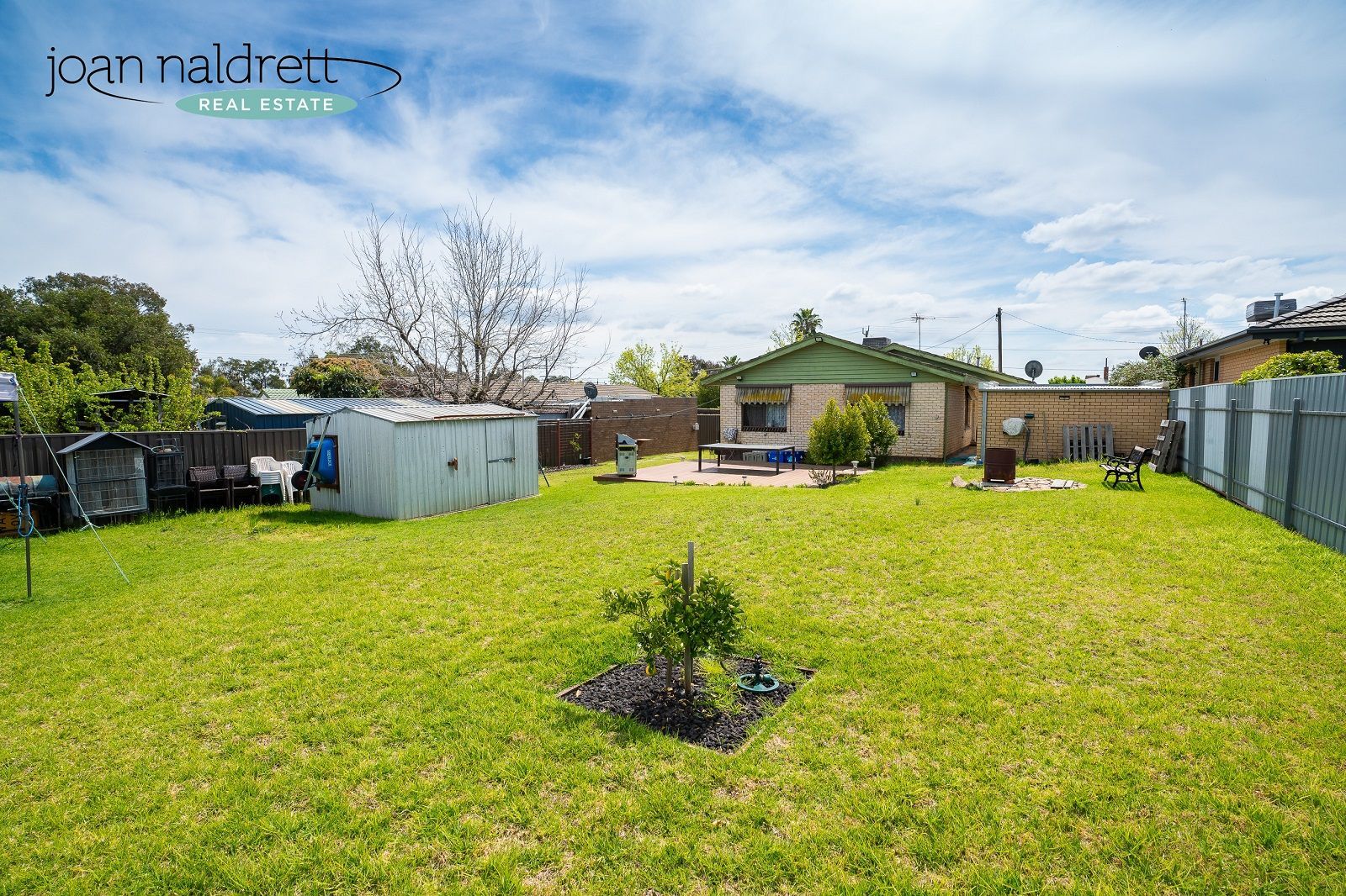 -All weather entertaining area, level lawn area & garden shed.