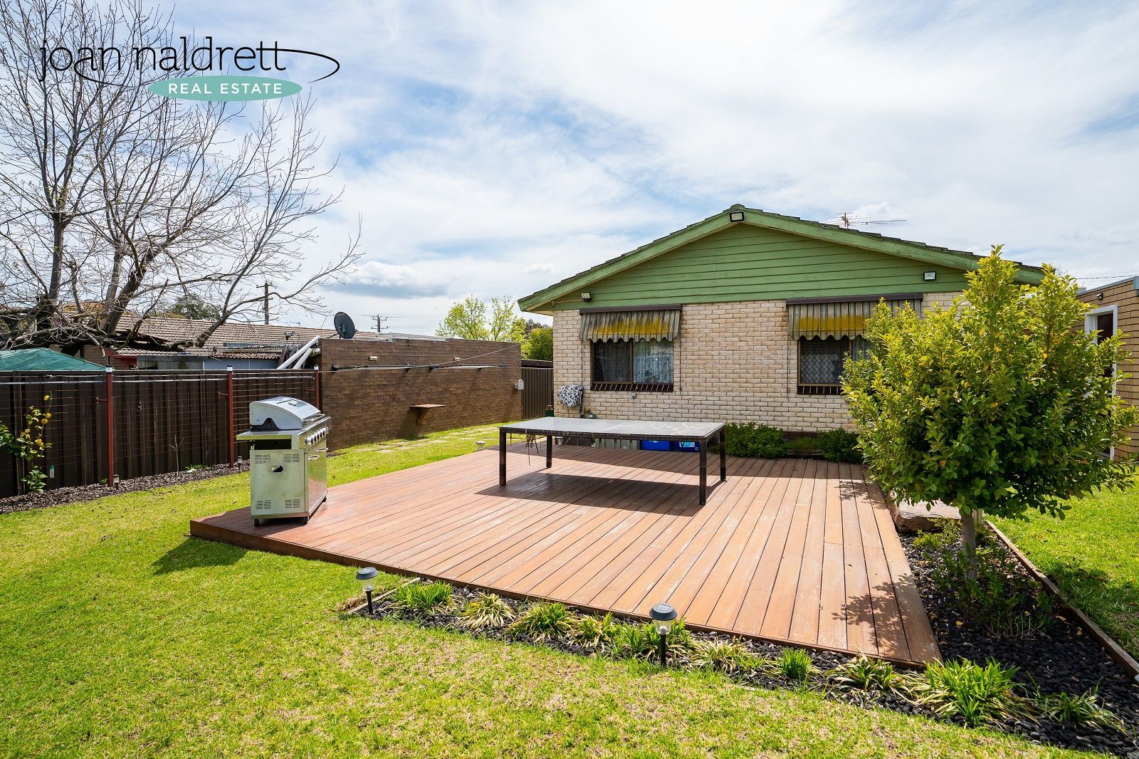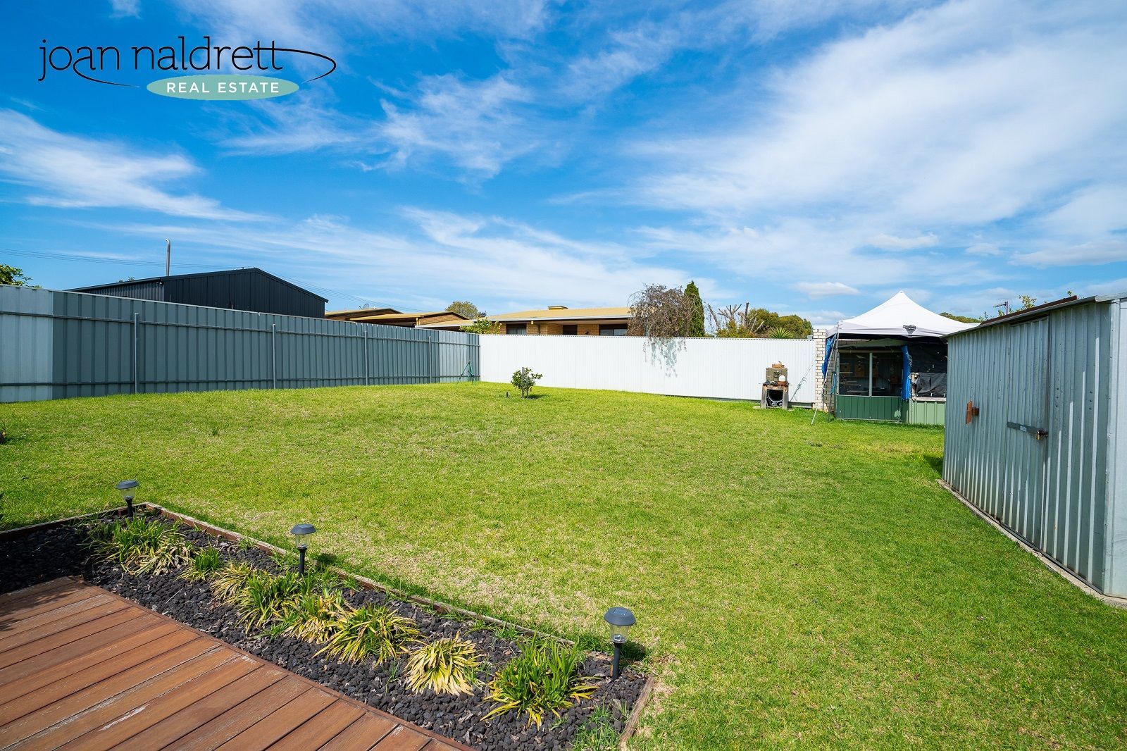 -Large level lawn area with timber deck & garden shed.